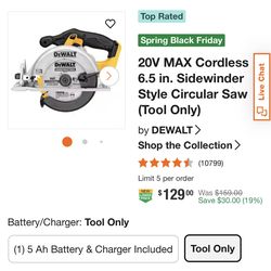 DEWALT 20V MAX Circular Saw, Cordless Sidewinder Style Portable, 6-1/2-Inch Blade, 5150 RPM, 0-50 Degree Bevel Capability, Battery Not Included$85Phoenix, AZ