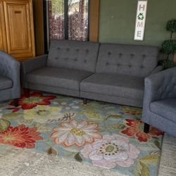 Great Gray Tufted Futon Whit Two Modern. Arm Chairs $375Avondale, AZ