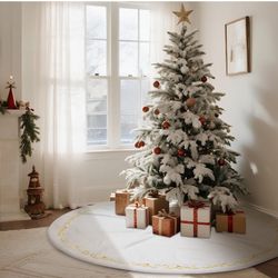 New HyDren 84 Inch Velvet Christmas Tree Skirt White Gold Bronzing Embroidery Fur Plush Tree Skirt Luxury Xmas Skirts For Merry Christmas Decorations $6Mesa, AZ