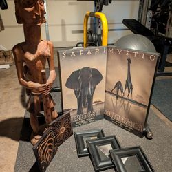 African Decor Lot β Hand Carved Statue + Vintage Safari Signs (1970sβ80s) + Art & Mirrors$150Phoenix, AZ