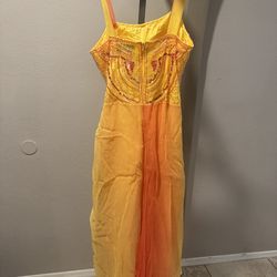 Yellow/orange beaded maxi dress with ruffle detail and tie back. Size: 10 #fairycore #prom #eveningwear$95Phoenix, AZ