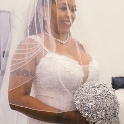 Wedding dress, veil, and jeweled bouquet$400Gilbert, AZ