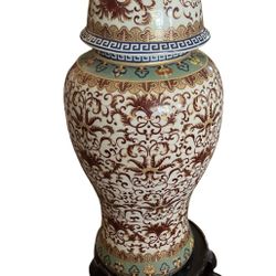 Vintage Chinese Heavy Porcelain Floral Lotus All Over Gold Overlay /Painted , Crackle Finish Temple Jur with Rose Wood Carved stand.$250Scottsdale, AZ