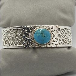 Silver Tone Filigree Cuff Bracelet With Round Turquoise Cabochon Center Vintage Style | Total Weight 26.7 grams$40Gilbert, AZ