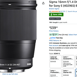 Sigma 16mm f/1.4 DC DN Contemporary Lens for Sony E (402965) Black$450Mesa, AZ