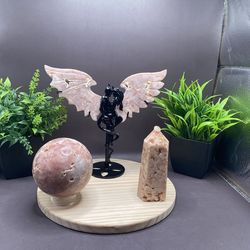 Hand Carved Druzy Sakura Pink Agate Forbidden Love Wings 208 g 7” x 7 1/2”, sphere 496 g of 72 mm, tower 187 g 3.8 inches bundle$75El Mirage, AZ