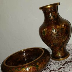 X2 VINTAGE CLOISONNE ENAMELED HAND PAINTED FLORAL FLOWER ACCENT TABLE DECOR BOWL DISH CENTERPIECE VASE SET$50Mesa, AZ