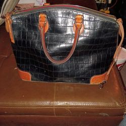 This item is a Dooney & Bourke Black Croco Embossed Leather Satchel Purse with brown leather trim and handles.