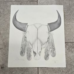 Darcy Marshall Sioux Native American Bull Skull Feathers Pencil Drawing 16.5x14"$100Scottsdale, AZ