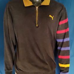 Vintage Puma Quarter Zip Pullover Men’s L Gray Red Blue Yellow Stripe Sleeve