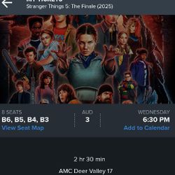 Stranger Things Series Finale Tickets - 4 Seats Together @ AMC Deer Valley 12/31 @ 6:30. $10 each. No Fees. Includes (4) $20 Food & Drink Vouchers$10Glendale, AZ