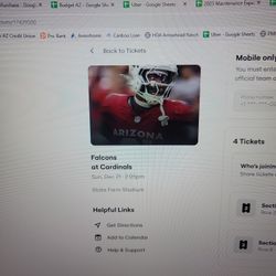 Cardinals vs Falcons Sunday December 21st Section 126 Row 14 Seats 5 & 6$110Glendale, AZ