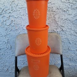 Vintage Tupperware Canister Set in Orange / 3 Piece Stacking Canisters with Starburst lids$60Tucson, AZ