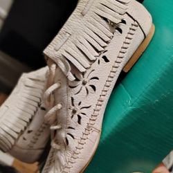 White Leather Fringed Ankle Moccasin Boots With A Hand Stitch Vamp And Floral Cut Out Details$10Tucson, AZ