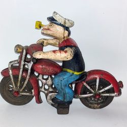 Rare Vintage Cast Iron Hubley Motorcycle Action Figure Toy Popeye The Sailor Man Red Hurley Davidson Patrol Style Rider Bike From The 1990's$140Richmond, CA