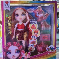 Rainbow High Ruby Red with Slime Kit & Pet 11'' Shimmer Doll with DIY Sparkle Slime, Magical Yeti Pet