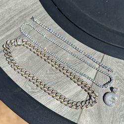 Diamond Cuban Link Chain In 14k Gold, Diamond Tennis Chain In White Gold (with Bracelet), Diamond “C” Pendant In .925 Silver$200Redwood City, CA