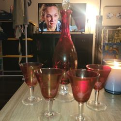 BEAUTIFUL Vintage CRANBERRY CUT 2 CLEAR Glass Decanter & 4 Wine Glasses ITALY!$150Los Angeles, CA