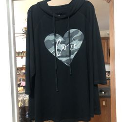 Women’s Size 26 / 28 Hooded Tunic Length 3/4 Length sleeves. Color Black the front has a heart says “Love”. Made of 70% Viscose, 26% Polyester and 4$25Artesia, CA