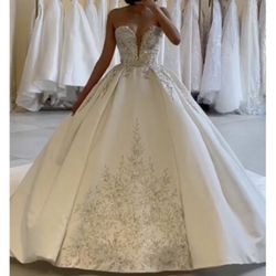 Monique Lhuillier Wedding Dress – Strapless Silk Satin Ball Gown with Wide Sash$800Glendale, CA