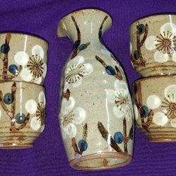 VINTAGE JAPANESE SAKE SET -BOTTLE, 4 CUPS WHITE FLOWERS -GREY, BLUE PLUM ACCENTS- 5" SPOUT ON CARAFE HAS BEEN REPAIRED SEE LAST PICTURE. A111M071$9Hesperia, CA