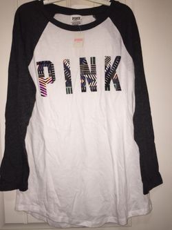 VICTORIAS VICTORIA’S SECRET PINK AZTEC PRINT BASEBALL TEE SIZE SMALL S GREY WHITE$35Fontana, CA