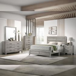 4pc Bedroom Set #1 Seller $499 Queen $599 Eastern King Includes Bedframe (No Boxspring Required) Dresser mirror nightstand Rustic Light Grey Bedroom $499Victorville, CA