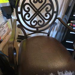 two wrought iron dining chairs with alligator-embossed brown leatherette seat cushions. $15Hesperia, CA