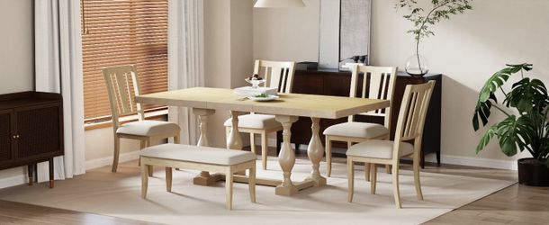 TOPMAX Traditional 6-Piece 78inch Trestle Extendable Dining Table Set with One 18inch Removable Leaf, Padded Dining Chairs and Bench,Natural$620San Bernardino, CA