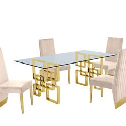 5pc Dining Set, Glass Dining Table w/Stainless Steel Gold Base & Velvet Pleated Chrome Support Dining Chairs, Beige$1,499Grand Terrace, CA