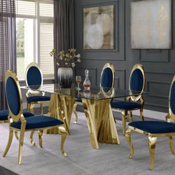 Classic 7pc Dining Set w/Uph Side Chair, Glass Table w/ Gold Spiral Base, Navy Blue$3,129Grand Terrace, CA