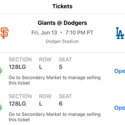 Dodgers Tickets 6/13$150Los Angeles, CA
