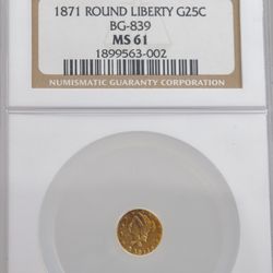 California gold fractional 25c 1871 ms61 ngc graded coin$360Garden Grove, CA