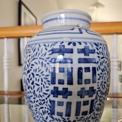 DOUBLE HAPPINESS BLUE AND WHITE PORCELAIN VINTAGE CHINOISERIE GINGER JAR W/LID$70Bakersfield, CA