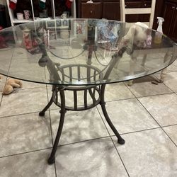 Glass patio table 4' round 28" high 4 chairs reversible cushions good condition clean. Sturdy metal frame table & chairs. $150 or Best Offer$150Bakersfield, CA