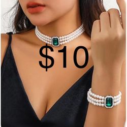Vintage Luxury Emerald Stud Earrings & Faux pearl Choker Necklace Set$18Pumpkin Center, CA