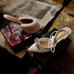 White Diamond Embellished Heel and Mauve Fur Stiletto Slip ons$60Pumpkin Center, CA
