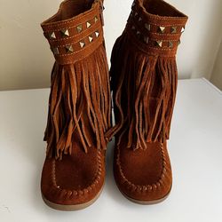Minnetonka brown suede fringe wedge booties featuring brass stud details$8Bakersfield, CA