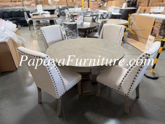 NEW 5 Piece Round Dining Table and Chair Set Distressed Grey RH Restoration Hardware Jerome Ashley Style Nailhead Upholstered Solid Wood Kitchen SALE$599Chino, CA
