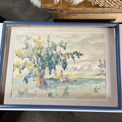Vintage Artwork Watercolor Calming Tree Landscape Teal Green Lavender $95Los Angeles, CA