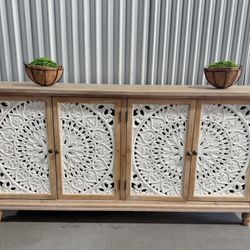 New Modern Farmhouse Carved Wood Sideboard Cabinet, White Mandala Carved Doors, Solid Wood Storage Credenza for Living Room, Dining Room or Entryway, $180La Mirada, CA