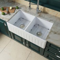 WFKS3318D 33" X 18" White Fireclay Double Bowl Farmhouse Apron Front Kitchen Sink with Strainers and Sink Protector Grid$250Norwalk, CA