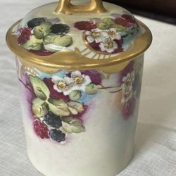 Hand-painted porcelain jar with lid, decorated with blackberries and flowers.$80Anaheim, CA
