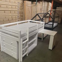 Twin loft bunk bed with desk & drawers. Available in grey & white. Assembly required. Assembly not included. Tax included. Free local delivery.