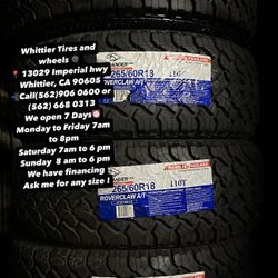 265/60R18 ATLANDER AT SET OF NEW TIRES , INCLUDING MOUNTING AND BALANCING. ASK ME FOR ANY SIZE OR BRAND, WE HAVE THE BEST PRICES OF CALIFORNIA$520Montebello, CA