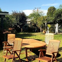 #3 Oval patio Teak Table w/ leaf extension Grade A Solid Teak, 4 folding Armchairs. No damage to the table or chairs. 94"Lx43"W×29"H$1,200Whittier, CA