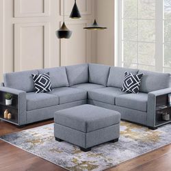 4-Piece Sectional Set W/ Ottoman RAF/LAF One-Arm Loveseat W/ Built-In Shelf + Corner Wedge + Cocktail Ottoman Color: Gray ☎️📲(213)713-74-89. $750Westminster, CA