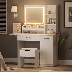 5-Drawers White Wood LED Push-Pull Mirror Makeup Vanity Sets Dressing Table Sets with Stool and 3-Tier Storage Shelves$130Upland, CA