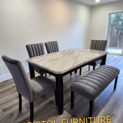 🥊 Dining Set 6 Pc, White Top Faux Marble, Black Wood, Gray Velvet Fabric, New In The Box.$650Santa Ana, CA