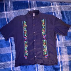 Men's navy blue Mexican guayabera short-sleeve shirt with multicolored floral and hummingbird embroidery$40Los Angeles, CA
